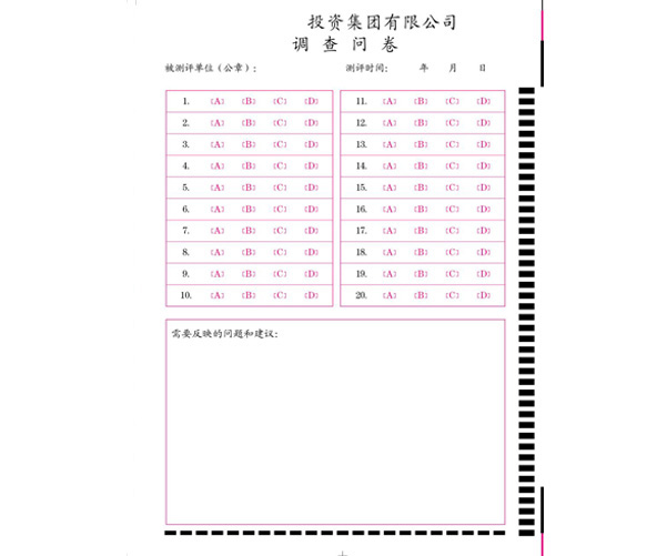 答題卡(又稱信息卡),是光標(biāo)閱讀機(jī)輸入信息的載體,是配套光標(biāo)閱讀機(jī)的各種信息錄入表格的總稱。信息卡將用戶需要的信息轉(zhuǎn)化為可選擇的選項(xiàng),供用戶涂寫。OMR設(shè)備根據(jù)信息點(diǎn)的涂與未涂和格式文件設(shè)置將信息還原。