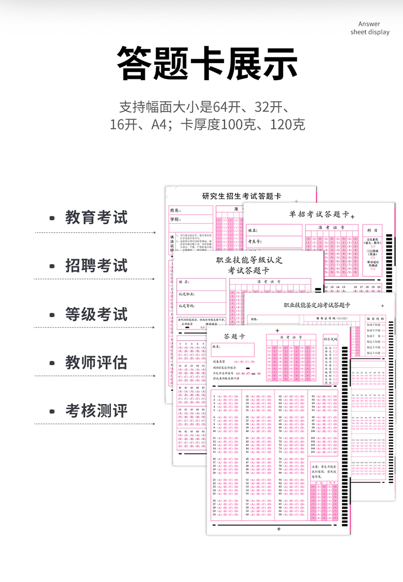 主要應用于學校,培訓機構,職業(yè)鑒定站,考試評卷、考試報名、志愿統(tǒng)計、各行各業(yè)的干部測評、考核、選舉,特別是全國性的人口、工業(yè)、農業(yè)、林業(yè)等行業(yè)用卡量多和時間緊迫且要求準確率更嚴格的讀卡。機器免調試。